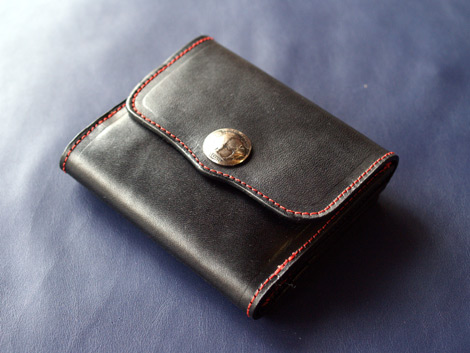 比較的男性の注文が多いタイプですが,、色を変えたり、ふたにコンチョをつけたりして、女性からのご注文もあります。小銭入れにお札も入りますので、普段は小銭入れの部分だけで使用できます。このサイフは、ホックを2箇所使用しておりますので、定期的な交換が必要となります。耐久年数は、個人差がございますが、3年から6年ほどです。ホックが甘くなりましたら、ご連絡ください。
